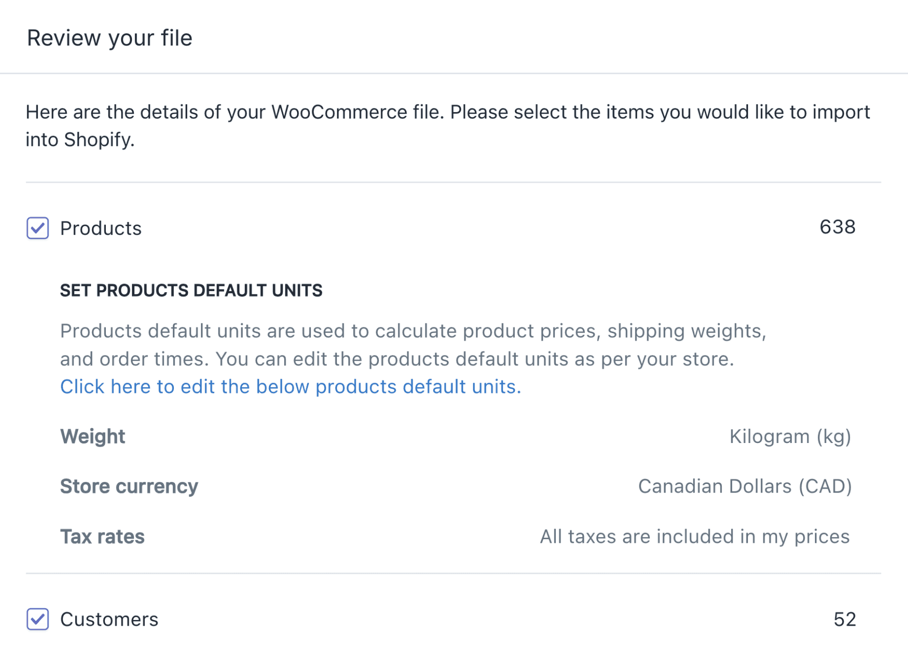 Here are the details of your WooCommerce file. Please select the items you would like to import into Shopify.